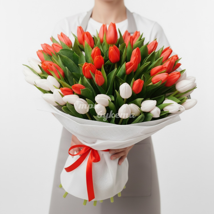 - Красные и белые тюльпаны, 101 шт.