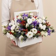 Белые розы и эустомы в коробке