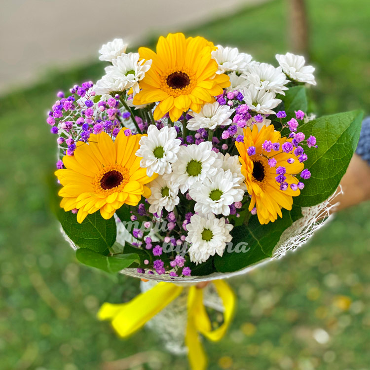 Букет из желтых гербер и белых хризантем