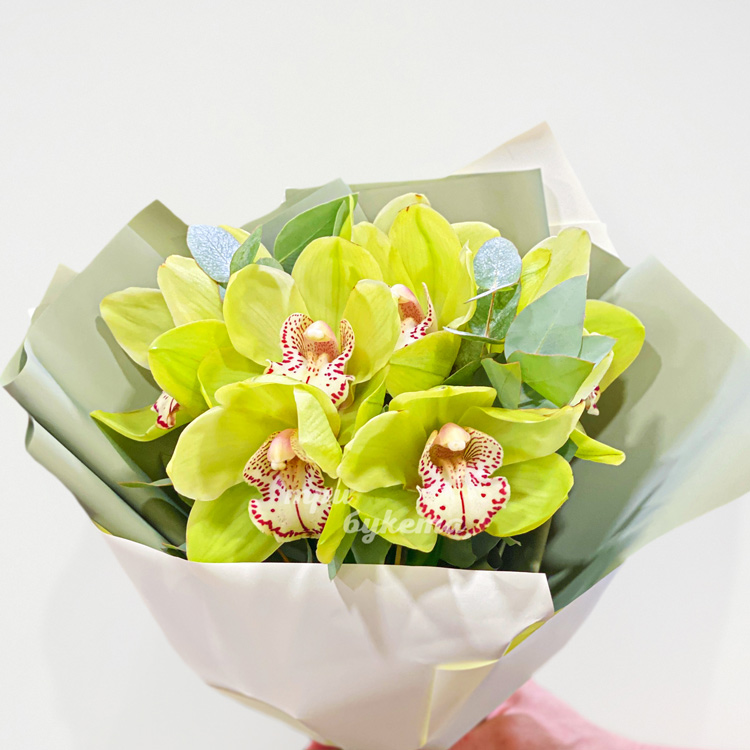 Букет зеленых орхидей с эвкалиптом