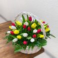 Корзина ярких роз с гипсофилой и лимониумом