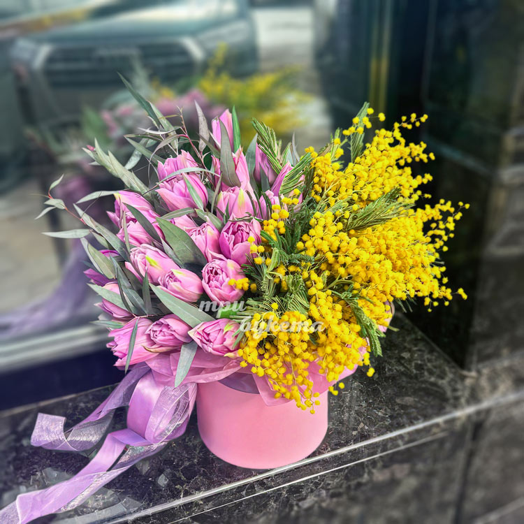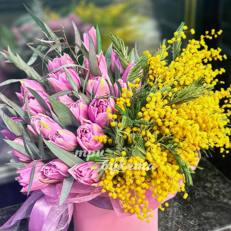 Шляпная коробка с мимозой и тюльпанами